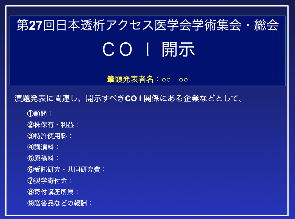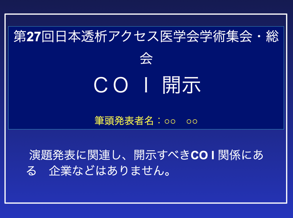 発表の最初か最後に利益相反自己申告に関するスライドを加えてください。
