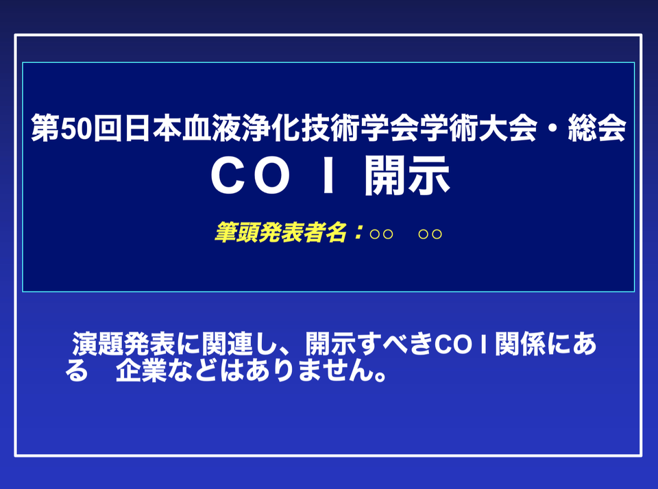 発表の最初か最後に利益相反自己申告に関するスライドを加えてください。